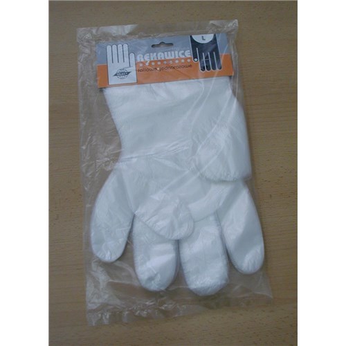 Rękawice higieniczne oburęczne wykonane z folii HDPE.