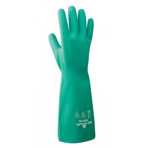 Odporne chemicznie rękawice ochronne Showa 730 wykonane są z kauczuku syntetycznego z powierzchnią nitrylową. Posiadają właściwości chemoodporne na oleje, substancje ropopochodne, smary, n-heptan, wodorotlenki oraz kwasy. Zabezpieczają także przed nadtlenkiem wodoru, amoniakiem i formaldehydem. Rękawiczki są bardzo szczelne dla cieczy - nieprzepuszczalne. Powierzchnia robocza chwytna wykończona przeciwpoślizgowym protektorem, szczególnie docenianym w mokrym środowisku pracy. Wewnątrz znajduje się flok bawełniany, który nie tylko absorbuje pot, ale również poprawia komfort pracy. Anatomiczny krój zmniejsza zmęczenie dłoni i nie ogranicza swobody ruchów. Posiadają przedłużony mankiet, który daje dodatkową ochronę przed brudem i cieczami. Wytrzymałe rękawice są odporne na rozciąganie i przetarcia. Mają długość 33 cm i grubość 0,38 mm. Dzięki temu zabezpieczają nie tylko dłoń ale i część przedramienia. Posiadają także dopuszczenie do kontaktu z żywnością i zapewniają ochronę biologiczną.