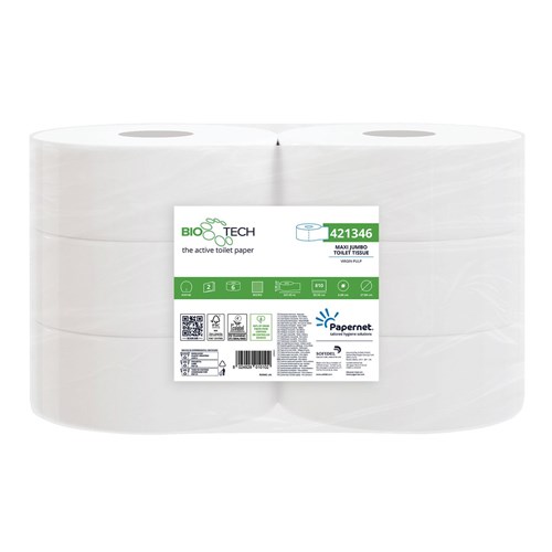 Papier toaletowy typu maxi jumbo, dwuwarstwowa biała celuloza biotech, 247 mb papieru w rolce. Opakowanie handlowe i zbiorcze zarazem, zawiera 6 rolek.