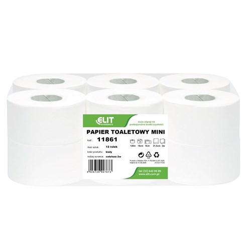 Dwuwarstwowy, biały, celulozowy papier toaletowy w roli o długość rolki ok 120m. Opakowanie handlowe zawiera 12 rolek papieru. Ilość na palecie - 70op