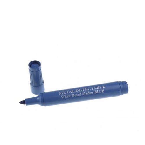 Wykrywalny niebieski marker ścieralny ze ściętą końcówką, niebieski wkład. Opracowany z myślą o pisaniu po tablicach suchościeralnych.