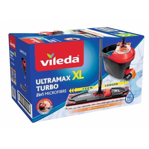 Kompletny zestaw do mopowania Ultramax Turbo XL z wyciskarką obrotową. W skład zestawu wchodzi wiadro z wyciskarką, stelaż na mop o szerokości roboczej 42cm, mop nakładka z mikrowłókna oraz kij.