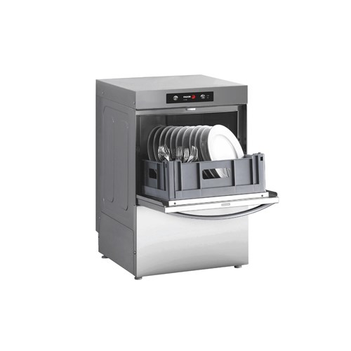 Zużycie wody wynosi 2 litry na cykl zmywania pod ciśnieniem 2 barów. Nowy zoptymalizowany system hydrauliczny EFFI-WASH jest wyposażony w ramiona do mycia wykonane ze stali nierdzewnej oraz pompę o mocy 0,26 kW, co pozwala zapewnić skuteczność, wydajność i najwyższą jakość mycia zgodnie z cyklem Sinnera. Zmywarka jest również wyposażona we wbudowany dozownik płynu do nabłyszczania i w pompę spustową oraz środek myjący. Urządzenie posiada nóżki, które można regulować, dostosowując je do potrzeb lokalu. Czujnik magnetyczny funkcji otwierania drzwiczek. Elektromechaniczny panel sterowania ułatwia obsługę operatorowi.