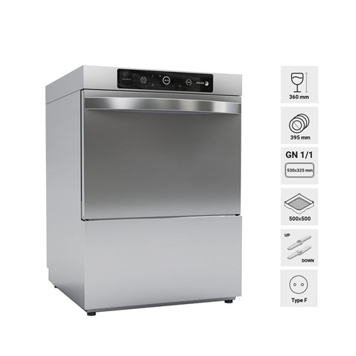 Profesjonalna zmywarka podblatowa wyposażona w dozownik detergentu i pompę płuczącą i spustową - kosz 500x500mm. Podświetlany, kolorowy wyświetlacz ciekłokrystaliczny o przekątnej 2,8" oraz klawiatura membranowa z pięcioma przyciskami. Linia Advance
