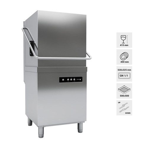 Profesjonalna zmywarka kapturowa wyposażona w dozownik detergentu - kosz 500x500mm. Interfejs elektromechaniczny z wytrzymałymi, podświetlanymi przyciskami. Modele „T” z dwucyfrowymi wyświetlaczami LED. Linia Concept